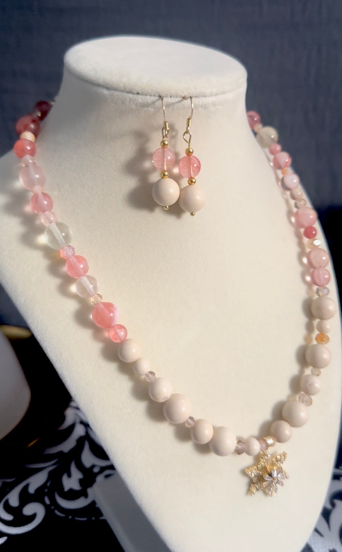 Add a touch of elegance and positive energy to your collection with this stunning necklace crafted from exquisite ivory jade, pink quartz, and sparkling crystal beads. The centerpiece of this enchanting piece is a spinning snowflake pendant, symbolizing transformation and balance, making it a perfect statement of both beauty and meaning. Paired with matching earrings, this set is the ideal accessory to elevate any outfit.